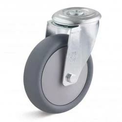 - Der kugelgelagerte Radkörper besteht aus Polypropylen, die ballige Lauffläche aus grauem, thermoplastischem Gummi mit ca. 85° Shore A.