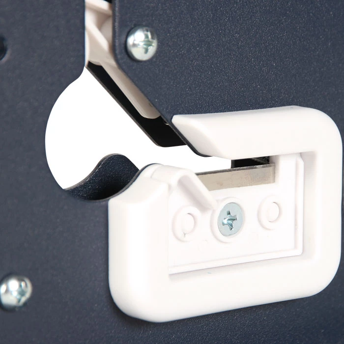 - Dank dem Sicherheitsmesser erhält man sauber abgeschnittene Klebekanten. Gerät am Arbeitsplatz anschraubbar.