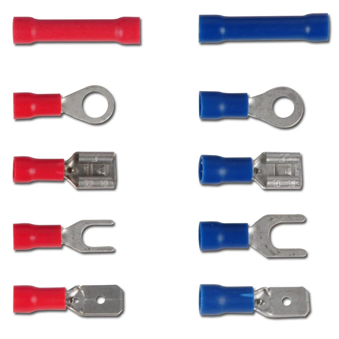 - 1. isolierte Kabelschuhe von 0,5 bis 6 mm² mit symmetrischer Ovalpressung (rot-blau-gelb)