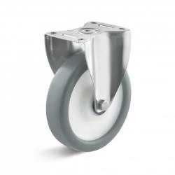 - Der zweifach kugelgelagerte Radkörper besteht aus Polypropylen, die Lauffläche grauem, thermoplastischem Gummi mit ca. 85° Shore A. Die Kugellager sind aus Edelstahl hergestellt.