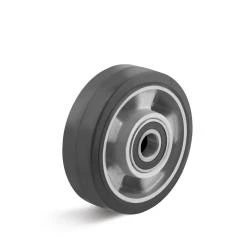 - Der kugelgelagerte Radkörper besteht aus Aluminium-Druckguss, die Lauffläche aus schwarzem Elastik-Vollgummi mit ca. 65° Shore A.