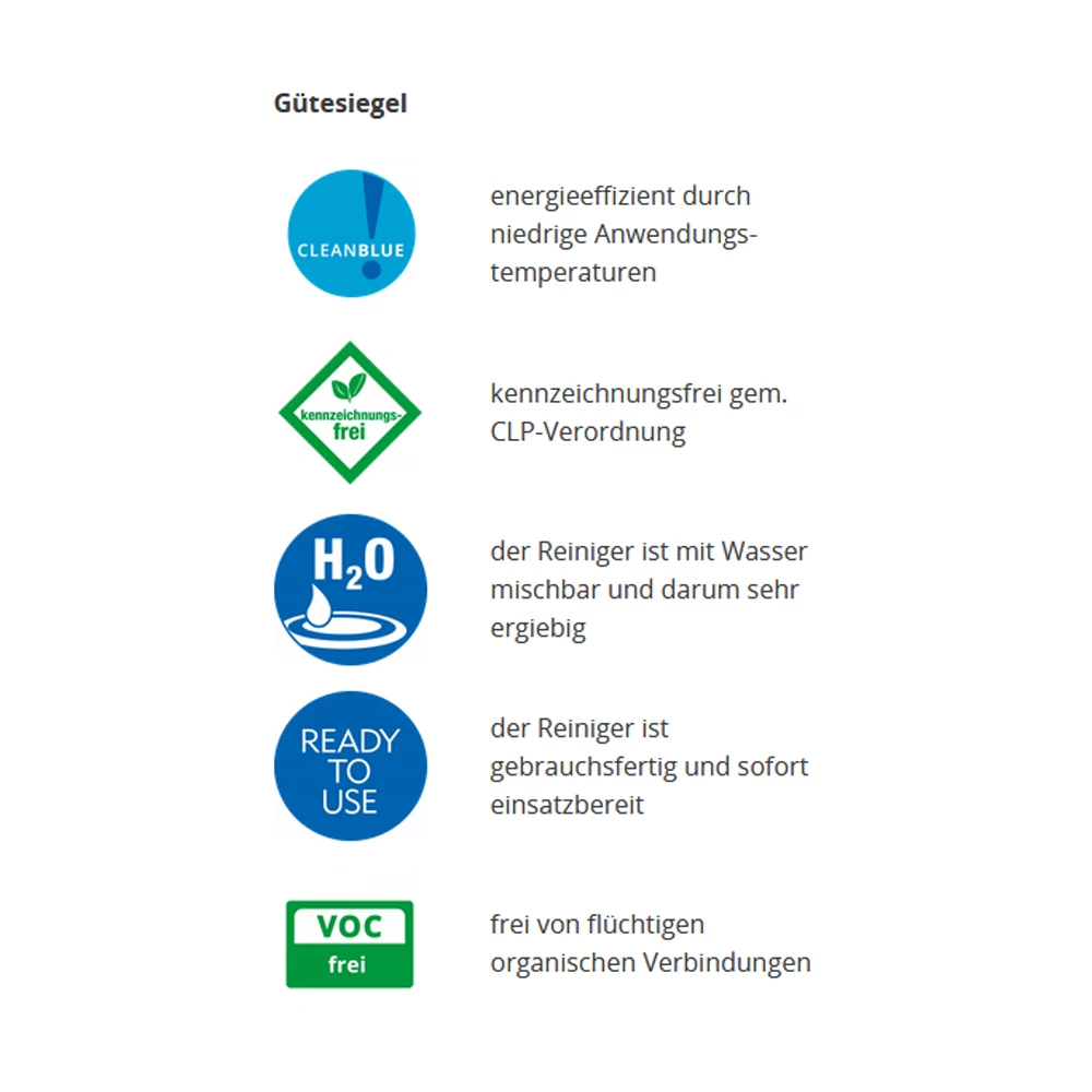 - Der hoch konzentrierte Reiniger kann bis zum Verhältnis von 1:100 mit Wasser verdünnt werden, ist somit sehr kosteneffizient und garantiert trotzdem eine hohe Reinigungsleistung.