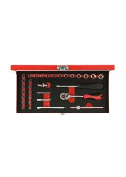 - Der Steckschlüssel-Satz wird in einem roten Stahlblechkoffer mit Schaumstoffeinlage verstaut und geliefert.
