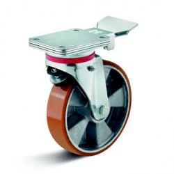 - Der kugelgelagerte Radkörper besteht aus Aluminium-Druckguss, die ballige Lauffläche aus Polyurethan mit ca. 92° Shore A.