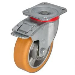 - Der kugelgelagerte Radkörper besteht aus Aluminium-Druckguss, die aufgegossene, zylindrische Lauffläche aus Polyurethan mit ca. 92° Shore A.