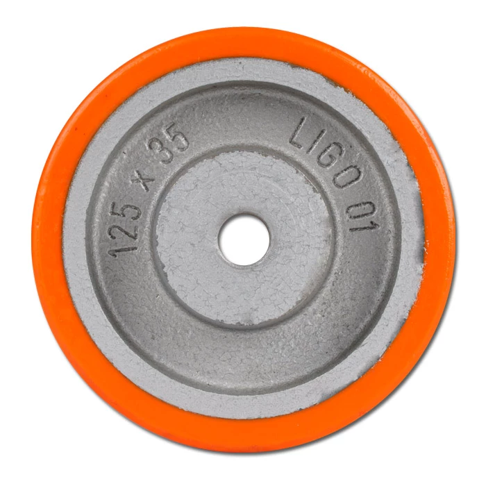 - Der gleitgelagerte Radkörper besteht aus Spezial-Grauguss, die aufgegossene, zylindrische Lauffläche aus Polyurethan mit ca. 95° Shore A. Das Rad verfügt über eine starke Nabe mit Kernbohrung.