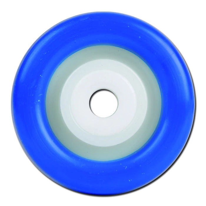 - Der gleitgelagerte Radkörper besteht aus Polyamid 6, die zylindrische Lauffläche aus blauem Polyurethan mit ca. 95° Shore A.