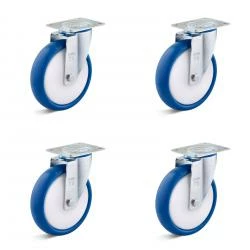 - Der kugelgelagerte Radkörper besteht aus Polyamid 6, die ballige Lauffläche aus blauem Polyurethan mit ca. 95° Shore A.