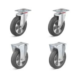 - Das kugelgekagerte Radkörper besteht aus Aluminium-Druckguss, die Lauffläche aus schwarzem Elastik-Vollgummi mit ca. 65° Shore A.