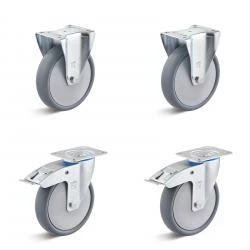 - Das Set besteht aus zwei Lenkrollen mit Doppelstopp und zwei Bockrollen.