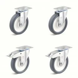 - Das Set besteht aus vier Lenkrollen. Zwei Rollen sind mit einem Doppelstopp ausgestattet.