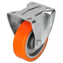 - Der zweifach kugelgelagerte Radkörper besteht aus Spezial-Grauguss, die aufgegossene, zylindrische Lauffläche aus Polyurethan mit ca. 95° Shore A.