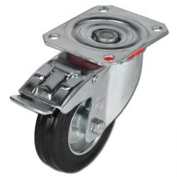 - Der rollengelagerte Radkörper besteht aus Stahlblech, die Lauffläche aus schwarzem, geruchsneutralem Standard-Vollgummi.
