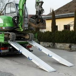 - Rampe zum Be- und Entladen von schweren Fahrzeugen wie Bagger, Radlader oder andere Baumaschinen, die auch mit Stahlketten ausgerüstet sein können.