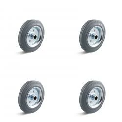 - Der rollengelagerte Radkörper besteht aus Stahlblech, die Lauffäche aus grauem, geruchsneutralem Vollgummi mit ca. 80 bis 85° Shore A.
